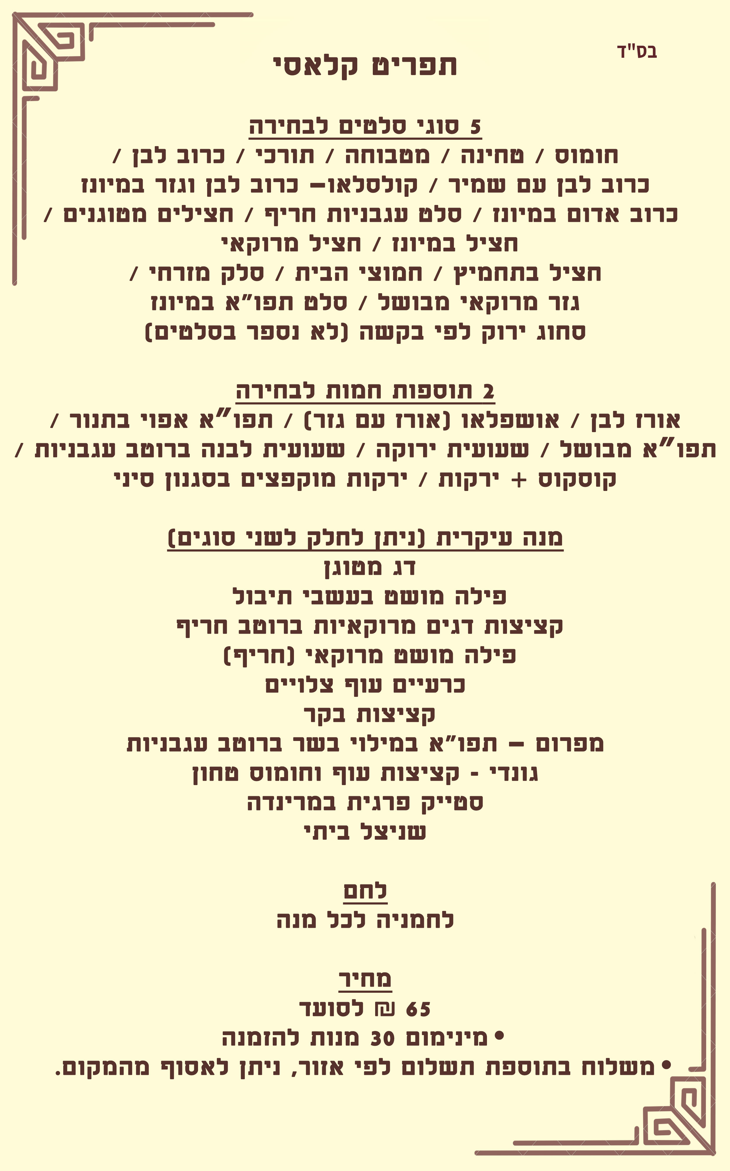 התפריט הקלאסי של פיבי, הוא התפריט המושלם לכל אירוע. ניתן לבחור מבין מגוון גדול של מנות כך שלא יחסר לכם דבר, לאירוע לא פחות ממושלם